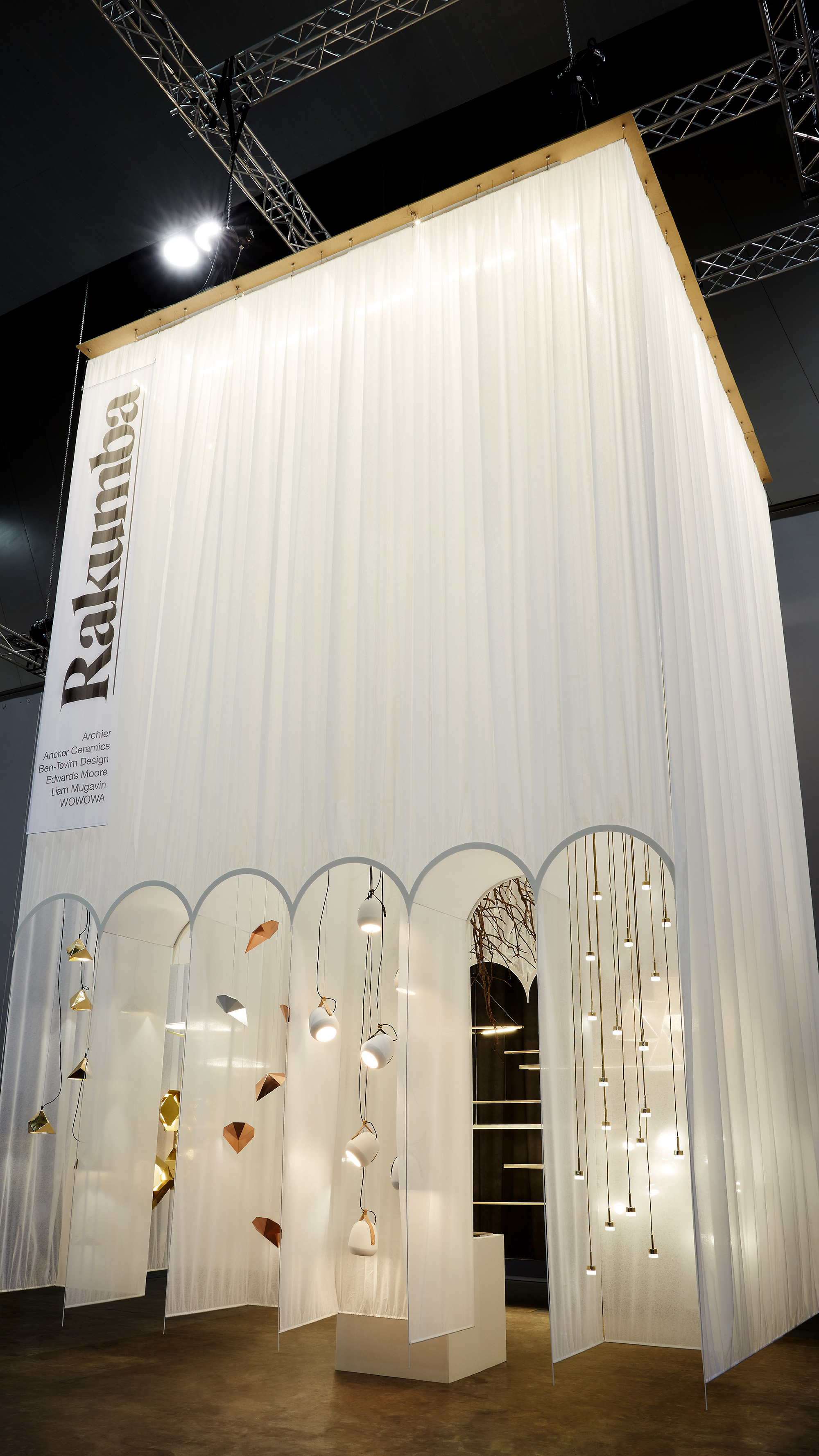 The monotone palette created a commanding, monolithic form that contrasted with the lightness offered through layering translucent interlacing fabric. Leveraging Rakumba’s skills of manufacturing lampshades, the design showcases the craftsmanship of their detailing. The fabric veil masks and reveals concurrently, displaying the glow of the pendants whilst disguising their form and detail. The floating form provided glimpses of the activities within, inspiring curiosity in the passing crowds. A tree suspended upside-down within the volume created ornamentation and complexity, transporting visitors from the bustling fair environment to an abstracted landscape that was focused and intimate.
