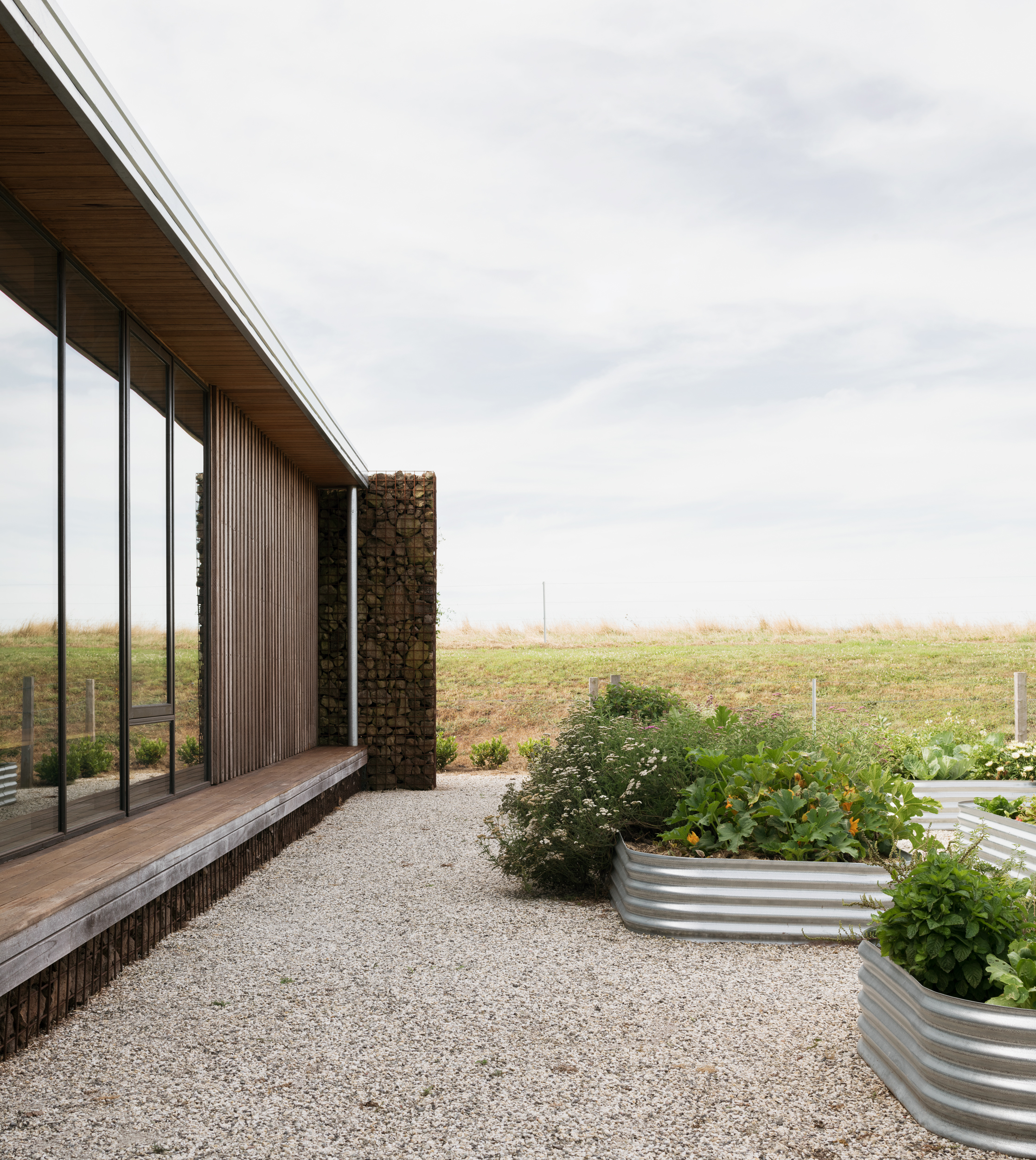 Volcanic rock literally emerges from the soil over time so it seems fitting to use it in this context. The clients erected and filled the gabion walls themselves. The building also creates shelter for a small but stunning garden: this complex ecosystem sits in contrast to the rolling green pasture.