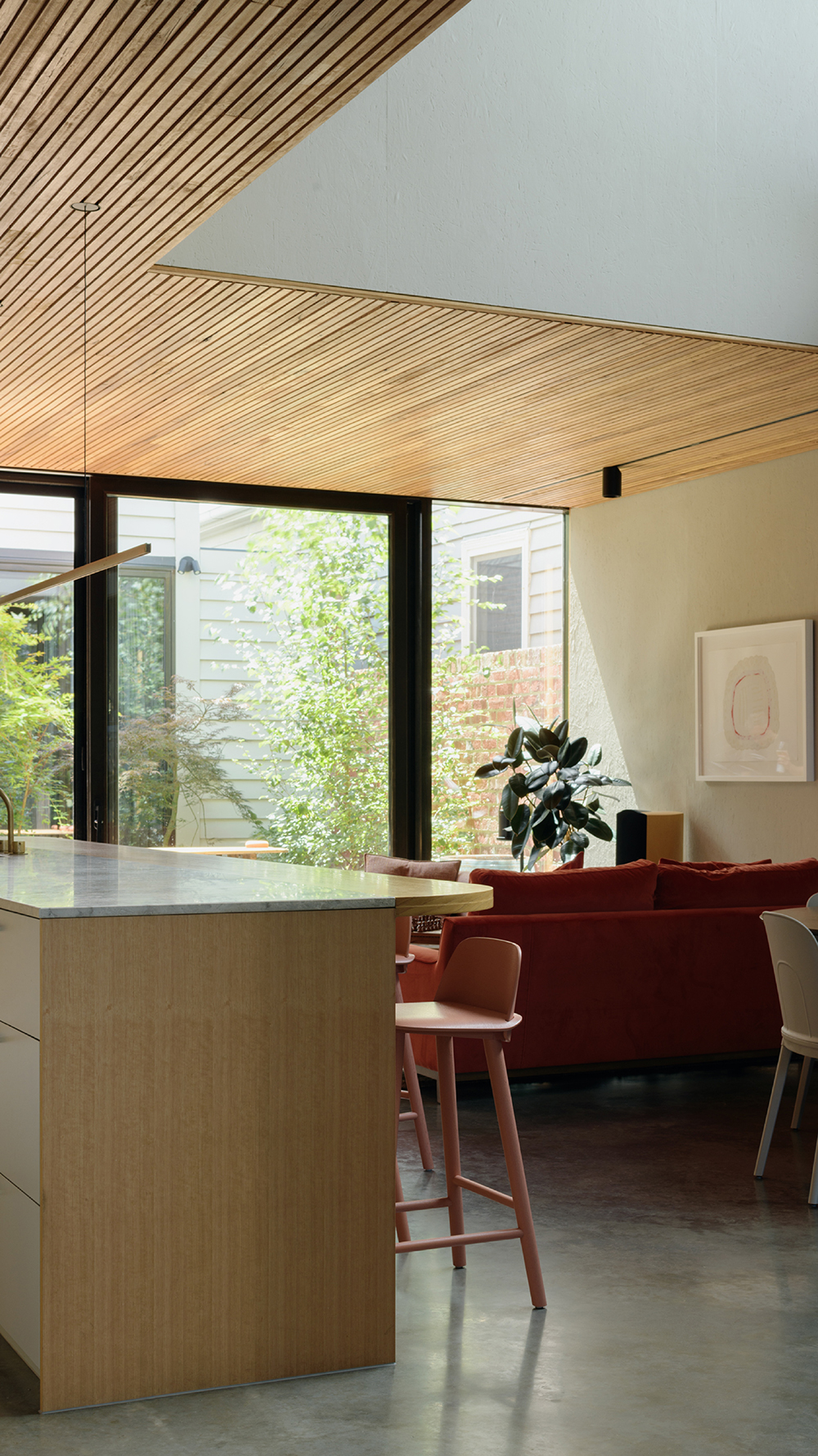 The design brief sought to maximise the experience of a constrained footprint, envisioning a home where productive gardens and sustainable principles form the foundation of daily life. Designed for a young couple and their two cats, the house is a collection of spaces that expertly balances grandeur with intimacy.