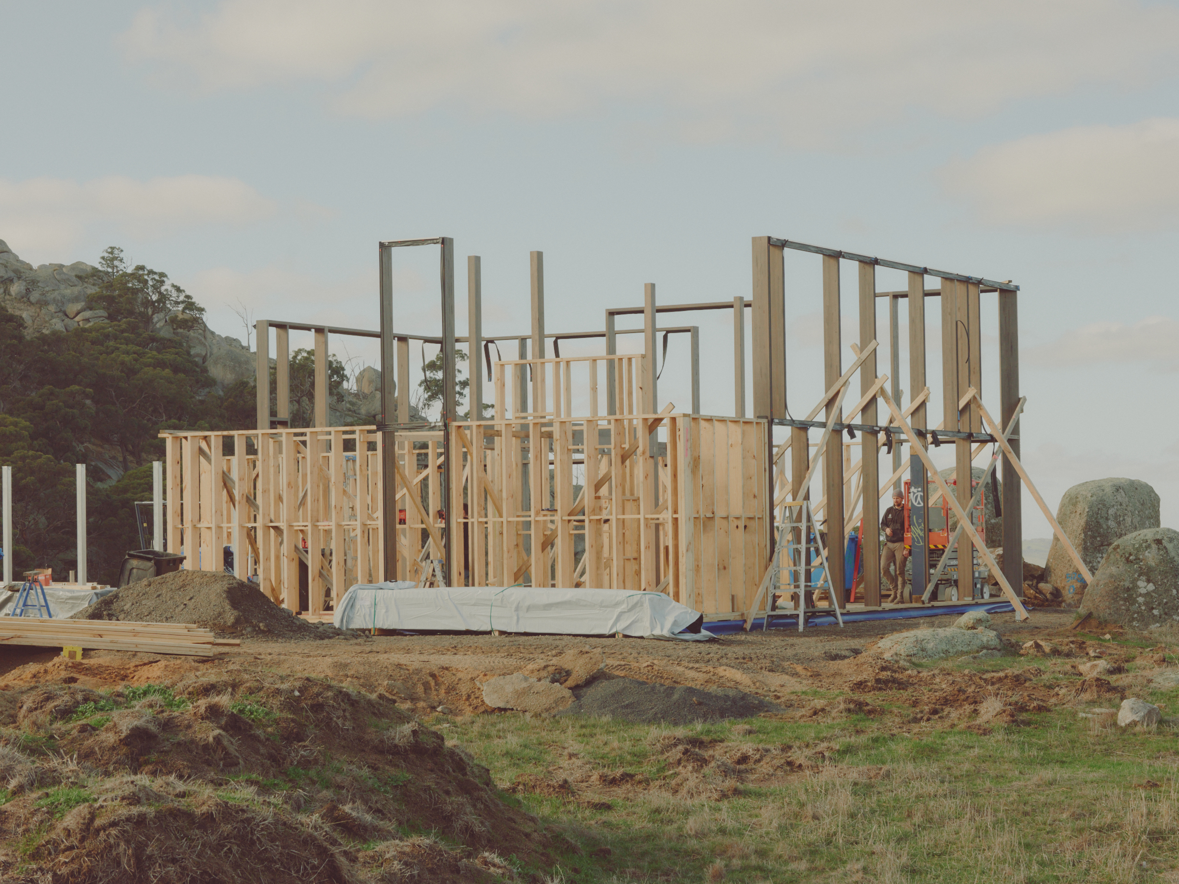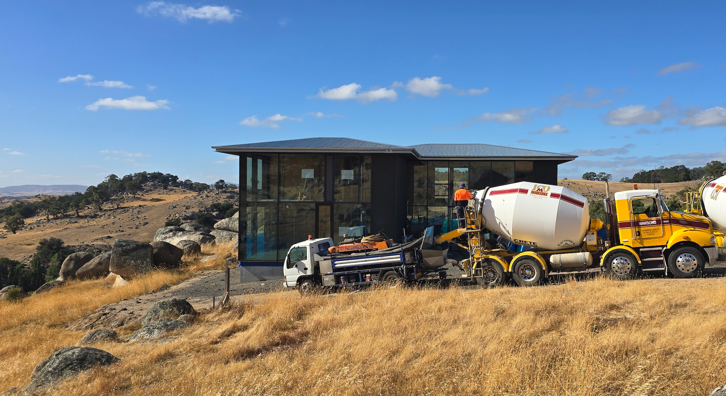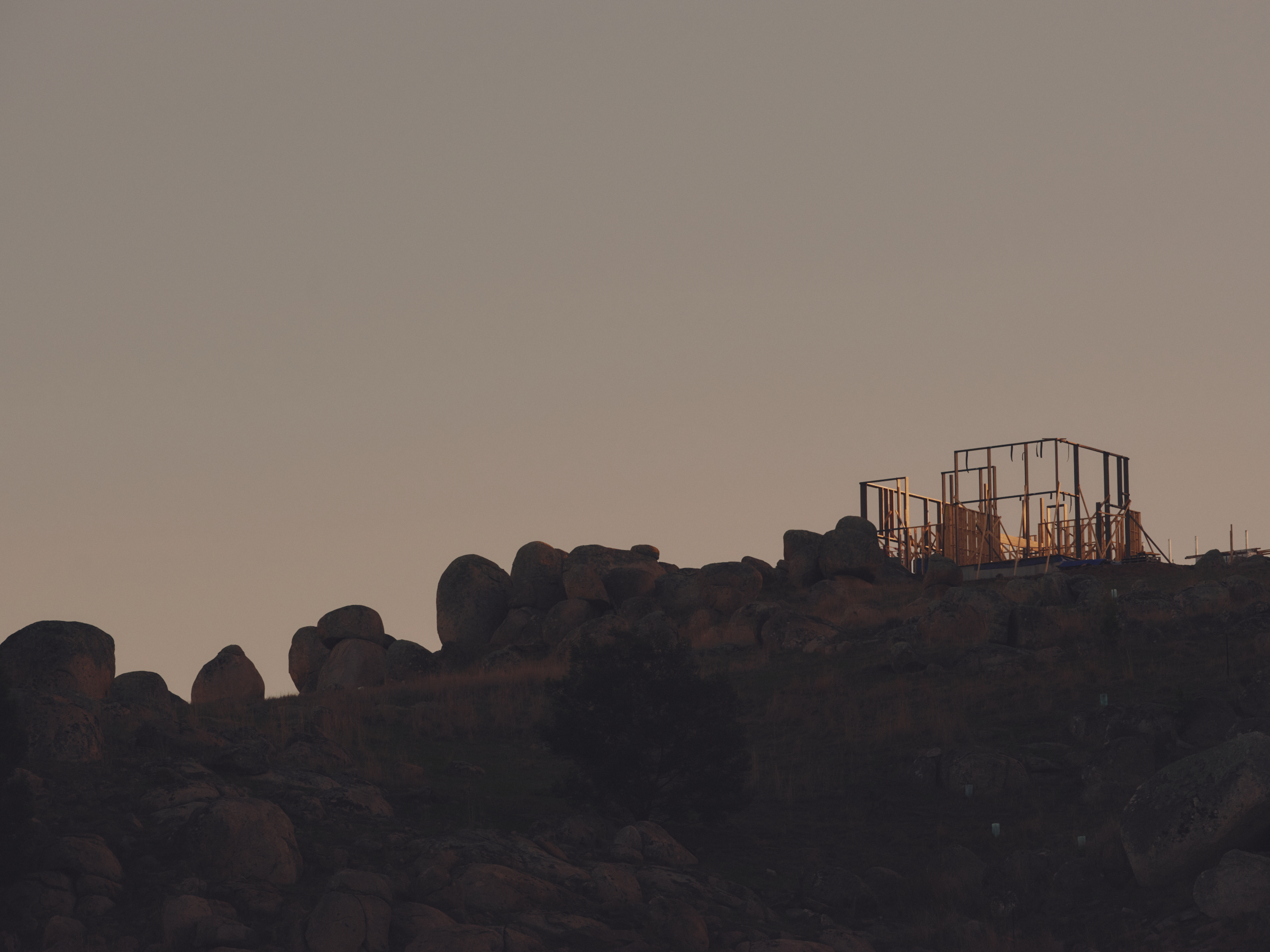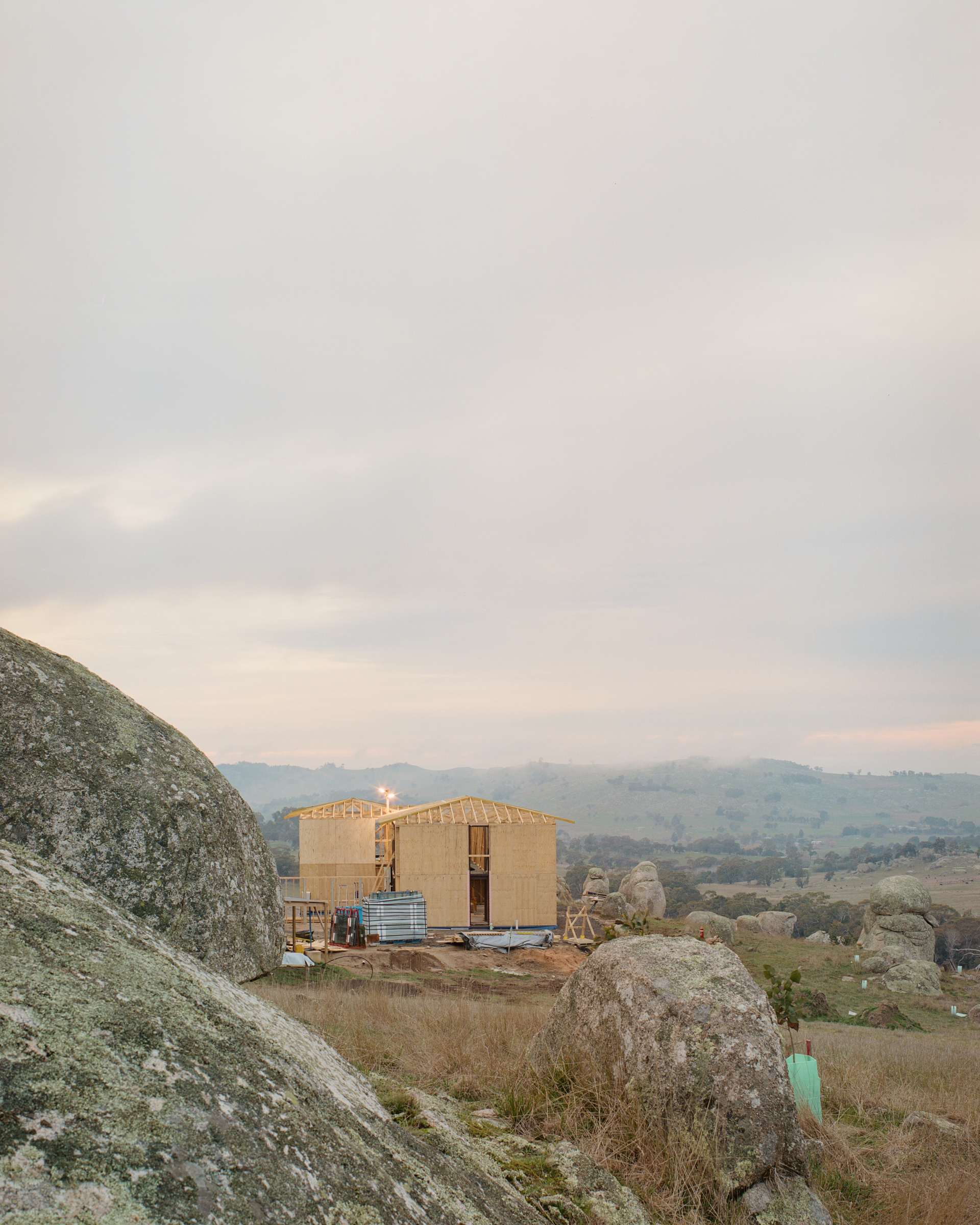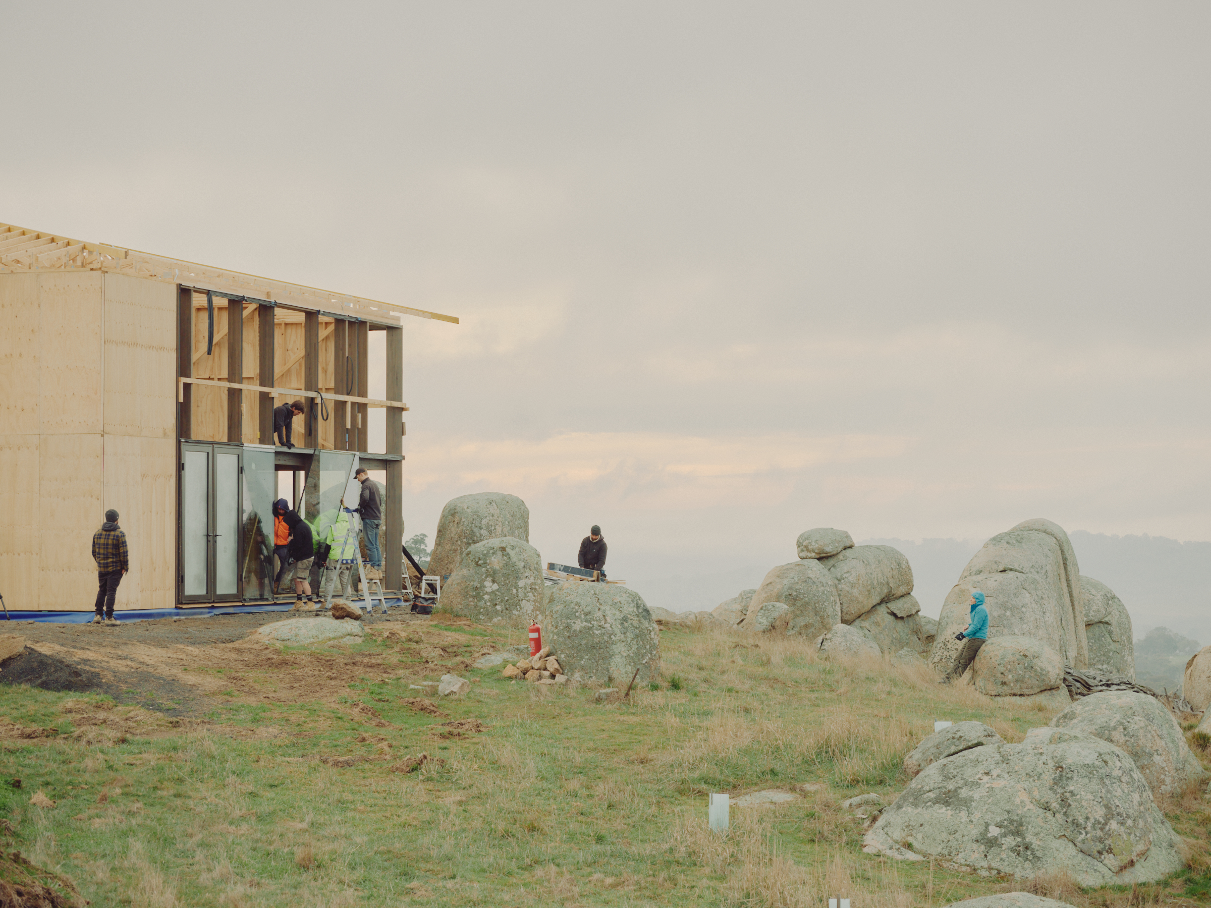 Set within the exposed volcanic plains of central Victoria, Tooborac House is an exercise in grounding. Perched on a rolling, windswept site, the dwelling is choreographed between monumental granite boulders, using the geology of the land to offer a sense of permanence and protection. The architecture adopts an agrarian exterior of FC sheeting and perforated metal — a robust, utilitarian shell designed to weather the exposure of the open landscape.