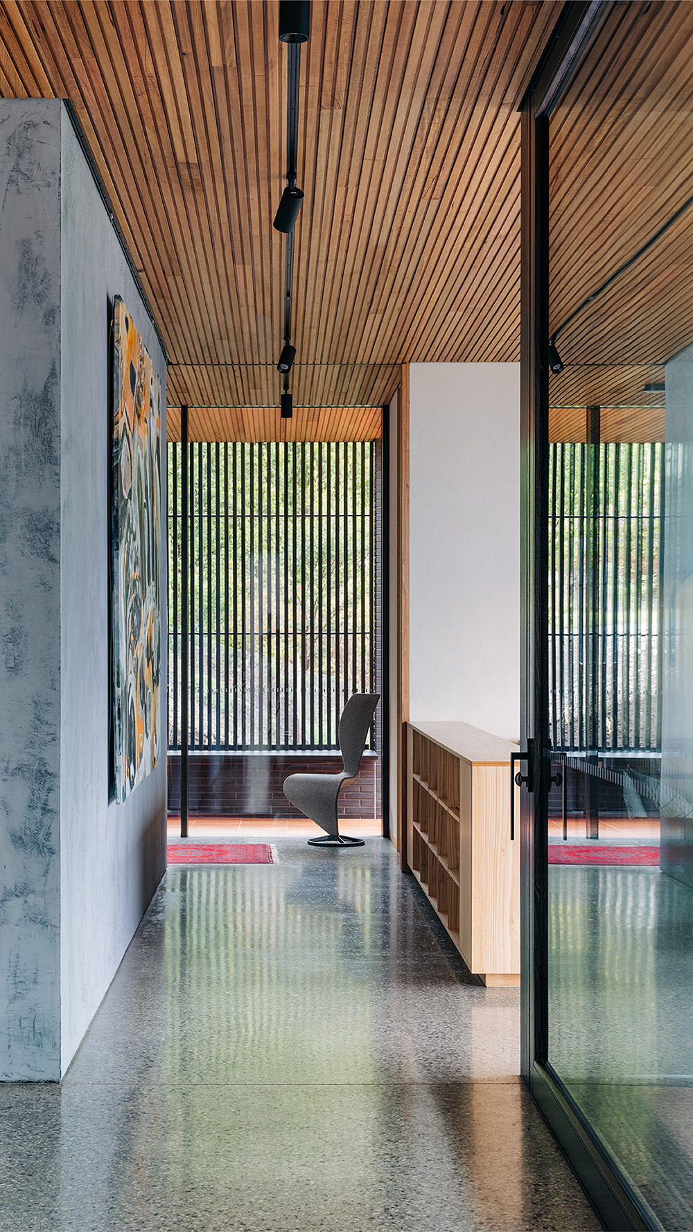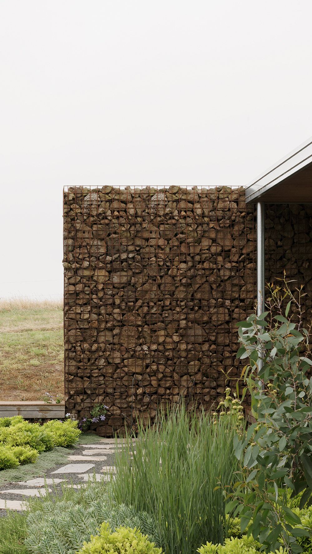 We designed a footprint that focuses the inhabitants’ experience toward the views of Hobart, which is balanced by shorter views – through courtyard spaces revealing the dolerite hillside of Mount Nelson – to help ground the clients in the site of the property. Separate yet strongly interconnected living zones create both privacy and flexibility, allowing for various living arrangements, supporting the clients’ wish to remain independent as they as age.
